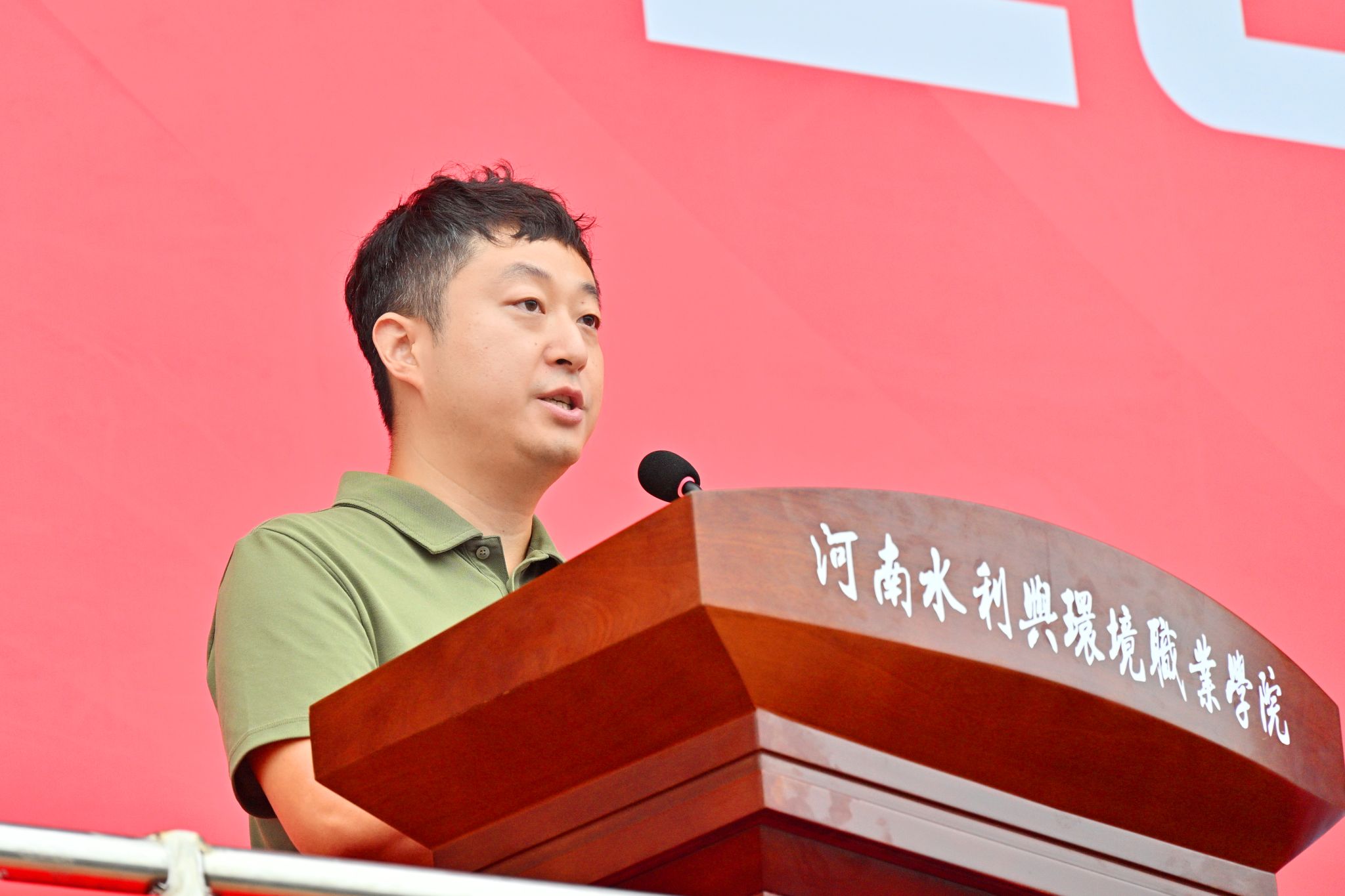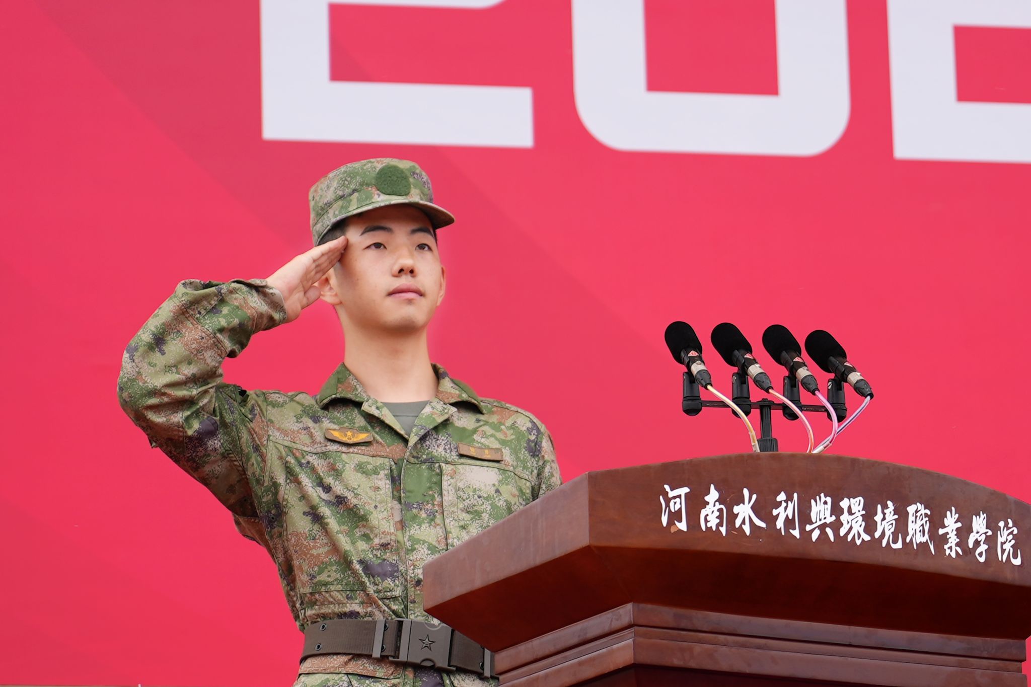 军训教官代表张鹏、杨勇发出号召,鼓励新生直面考验、超越自我,以昂扬斗志开启迷彩青春。